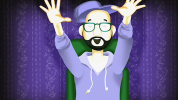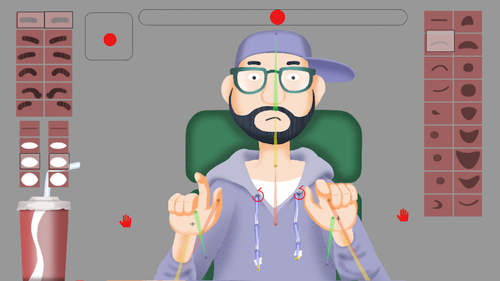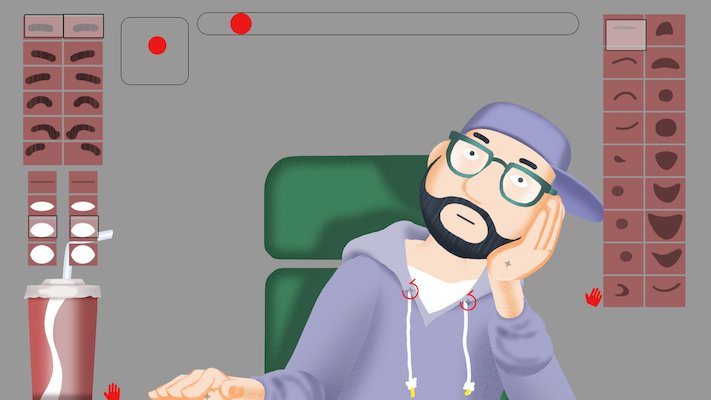 This character is constructed entirely in Photoshop and consists of nearly 80 individual parts. All parts are controlled by sliders of the animation layer. The construction of this setting and various masking works is complex, but finally it makes the animation wonderfully easy.